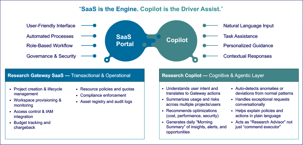 The copilot handles intent understanding, resource recommendations, cost and risk insights, and policy validation. Once the request is fully resolved, Research Gateway executes the provisioning securely and consistently.
